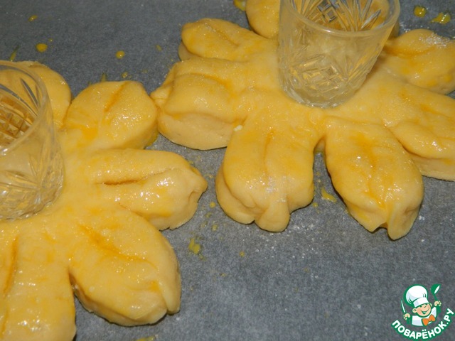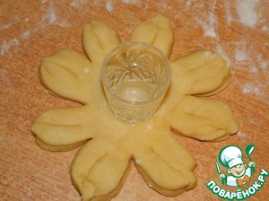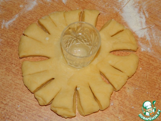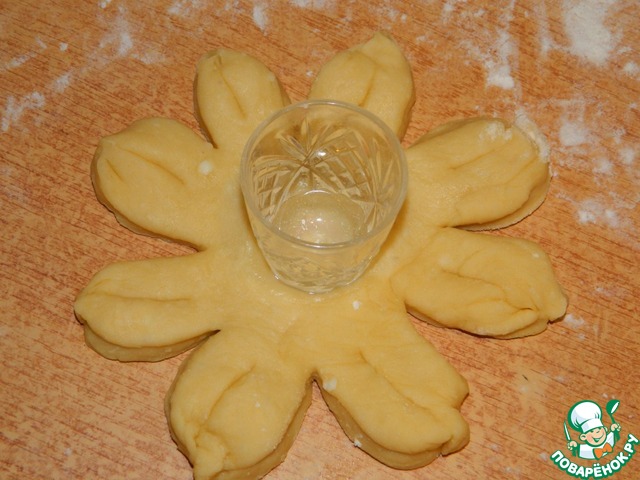 Затем от теста отрываем кусочки и раскатываем небольшую лепешку, в центр которой ставим рюмку, а по бокам делаем надрезы.