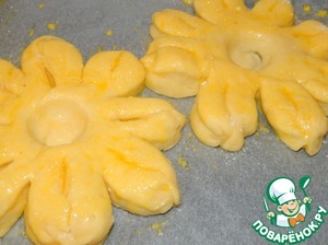Выкладываем цветочки на противень, застеленный бумагой. Даем подойти в тепле. Затем смазываем желтком.