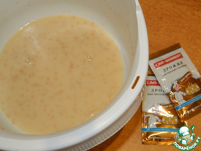 Смешать молоко, сахар, дрожжи и немного муки. Это наша опара. Оставить её в теплом месте на 20-30 минут.