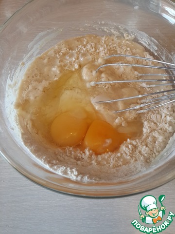 Вливаем опару в оставшуюся муку, добавляем сахар, ванилин, яйцо, желток, растопленное масло, замешиваем тесто