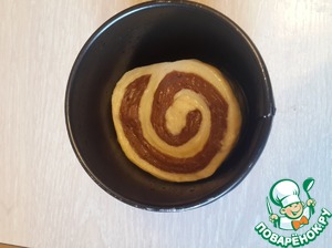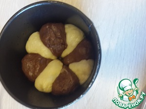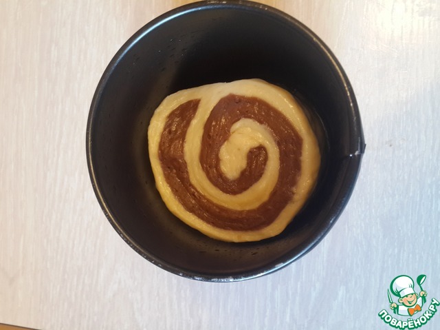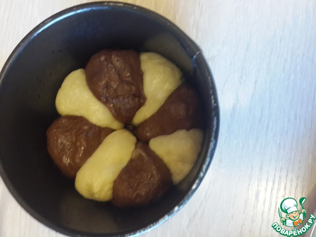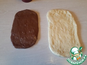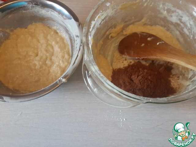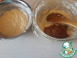 Тесто получается липкое. Делим его на 2 части. В одну добавляем какао. Оставляем тесто для подъема на пару часов