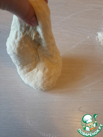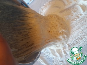 Теперь насыпаем на стол много муки, вываливаем тесто и начинаем подмешивать муку чтобы тесто стало мягким, но не липло к рукам