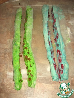 Раскатала зелёный колобок и насыпала на него распаренного изюма