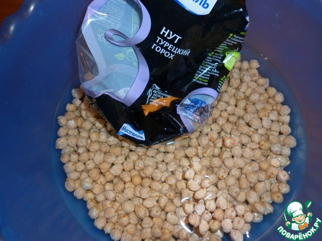 Нут залить прохладной водой на ночь. Миску с замоченным нутом желательно убрать в холодильник, во избежание закисания нута, в противном случае воду рекомендуется поменять пару раз.