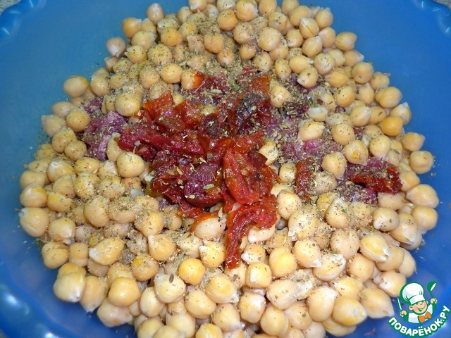 Смешать говядину и нут, добавить порезанные вяленые томаты, добавить сухой базилик и орегано, яйцо, соль и черный свежесмолотый ( солить и перчить по вкусу, мы не любим слишком соленое и перченое). Тщательно перемешать.