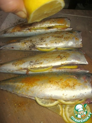 Начинить тушки лимонными колечками, хорошо сбрызнуть соком лимона