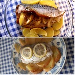 Нарезанные на дольки яблоки чуть припустить на сковородке со сливочным маслом и соком, полученным при запекании рыбки (можно не припускать, а положить сырыми)