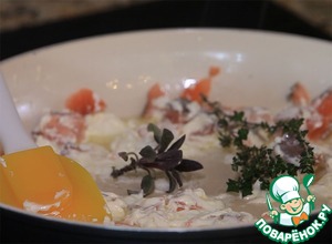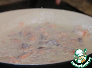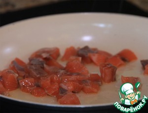 Все прогреть на сковородке до легкого изменения цвета семги, добавить сливки.
