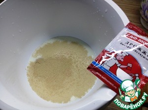 В теплое молоко добавить 1 ч. л. сахара и дрожжи, перемешать и отставить в сторону до появления шапочки пены.