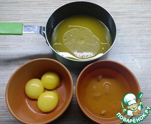 Желтки отделить от белков. Сливочное масло растопить, растворить в нем оставшийся сахар и оставить остывать.