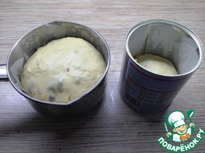 Выкладываем в форму, смазываем верхушки растительным маслом и оставляем еще минут на 20-30 пока тесто не поднимется в 2 раза. Я разделила на три части. Одну в ковш, объемом 1 литр, и две в баночки от детского питания.