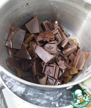 Горький и молочный шоколад растопим на водяной бане, добавляем туда коньяк или ликер (по желанию) и сливки. Хорошенько размешиваем до однородности