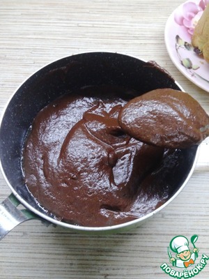 Приготовим глазурь: растопим в кастрюльке сливочное масло с сахаром. Добавляем какао-порошок и сметану. Постоянно помешивая, доводим массу до кипения.