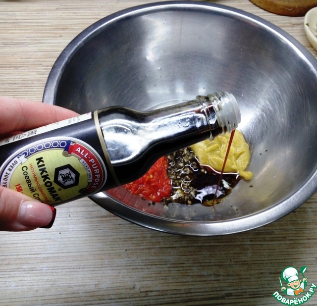В миске смешать томатную пасту (я взяла домашнюю), горчицу, уксус, соевый соус, перец с чесноком и оставшуюся чайную ложку сахара.