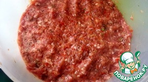 В миску кладём фарш и добавить мелко нарезанный лук.