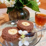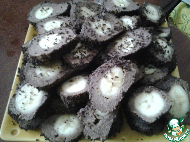 А теперь первый вариант подачи десерта. Шоколадно-творожную массу распределить на пищевой пленке. Сверху положить банан.