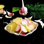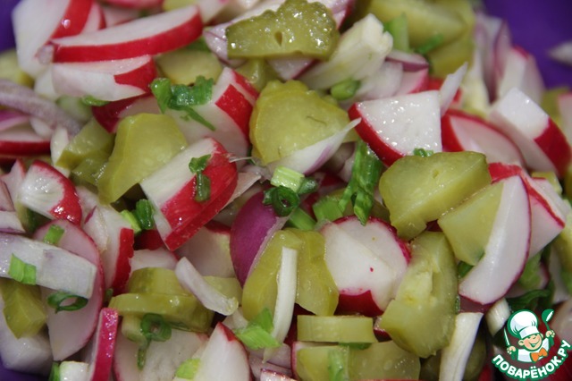 Я люблю, когда свежие овощные салаты нарезаны крупно, поэтому у меня - полукружия редиса, кружочки маринованного огурца и полукольца красного лука. Я не солила, т. к. вполне хватает солености маринованных огурцов. А заправить предлагаю каким-нибудь «пахучим» маслом – подсолнечным, кунжутным.