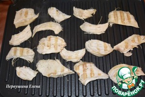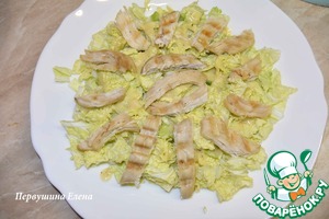 Выложить на капусту небольшие кусочки обжаренного куриного филе и