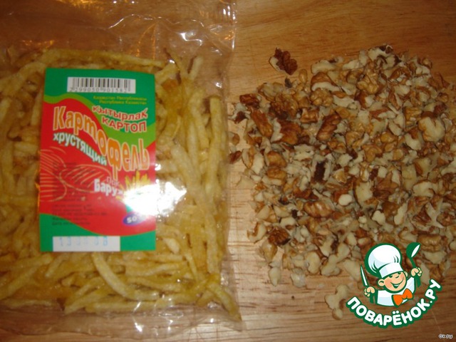 Орехи слегка порубить. Подготовить картошку, если есть готовая, использовать ее, если нет, порезать тонкой соломкой и пожарить в большом количестве масла.