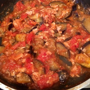 На СУХУЮ небольшую сковороду БЕЗ масла, не сильно разогретую, кладем овощи, пасту, посыпаем орегано, перемешиваем. Туда же выливаем немного сока из тунца, не весь, половинки хватит, овощи сами дадут еще немного жидкости. Закрываем крышкой и тушим на медленном огне 8-10 минут.