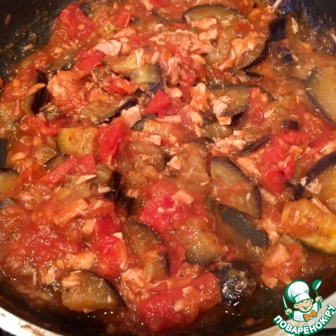 Теперь добавляем тунец, хорошенько перемешиваем, закрываем и тушим еще минутки 2-3.