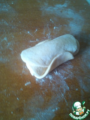 Когда наше тесто подошло, берем чуть меньше половины, для нижнего листа. Противень застелить фольгой.