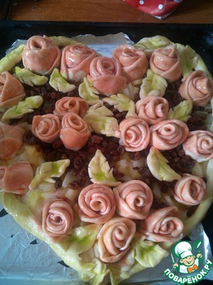 Разрезать на две половины, получится две розы, и так почти со всего теста, оставить на листочки, насаживаем розы на пирог.