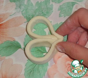 Слоеное тесто раскатать и порезать на полосочки. Сворачиваем каждую полоску как показано на фото.