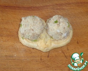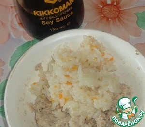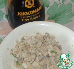 Отварное рыбное филе хорошо размять и соединить с соевым соусом Kikkoman по вкусу. Добавляем зеленый лук.