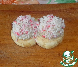Крабовые палочки разморозить и мелко покрошить. Обсыпаем начинку крабовыми палочками.