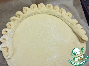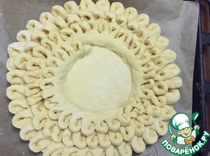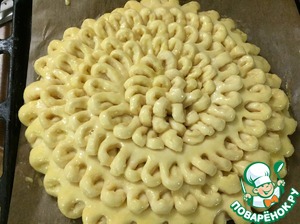 Полоску складываем пополам, прижимаем ненадрезанные края и укладываем по краю пирога, при этом расправляем кудри, как бы разворачивая, дырочкой кверху. Делаем несколько полосок, так как одной лентой не удобно