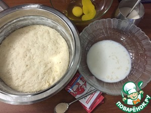 Готовим тесто: в теплом молоке растворить вторую порцию дрожжей, сахар, соль, добавить опару, слегка взбитые яйца, перемешать, добавляя порциями муку. Когда тесто будет еще липкое, но уже сформированное вмесить размягченный маргарин, домесить муку. Тесто должно быть эластичным, но не забитым, накрыть и убрать в теплое место на 2-2,5 часа