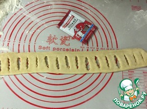 Обминаем тесто, делим на 2 части, одну раскатываем в круг, диаметром 25 см, укладываем на противень, смазанный маслом или застеленный пекарской бумагой. Из второй части делаем колбаски, раскатываем полоски, шириной 8 см, толщиной 3 мм, на полоске делаем надрезы, примерно через 1 см