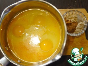 Для теста вливаем в сотейник сливки, добавляем масло, сахар и соль. Ставим на плиту и подогреваем до температуры 40 градусов. Снимаем с подогрева, добавляем цедру и яйца, хорошо взбалтываем. Готовим приправы. Всыпаем их в яично сливочную смесь