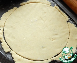 Через пол часа берем тесто разрезаем пополам. Готовим форму для выпечки 24см. Застилаем ее пергаментом дно и бока. Берем половинку теста и раскатываем в круг, укладываем его на дно формы, смазываем 1 ст. л джема (джем у меня домашний и довольно жидкий).
