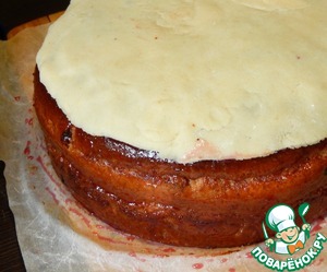 Когда торт остынет раскатываем еще один пласт марципана вырезаем круг нужного диаметра и накрываем верх торта.