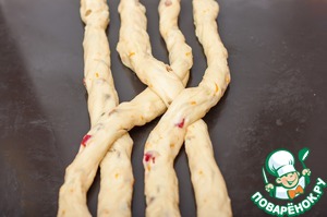 Разделите тесто на 3-4 жгута и заплетите косу. Я плела косичку из 4-х жгутов.