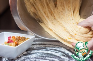 Всыпьте изюм и цукаты и хорошенько обомните тесто. А теперь очень важный нюанс: тесто нужно "отбить", для этого нужно его взять в руки и ударить об стол, чем больше раз вы это сделаете - чем воздушнее будет кулич. Хорошие болгарские хозяйки говорят, что это нужно сделать как минимум 100 раз, на тесте должны появиться воздушные пузырьки.