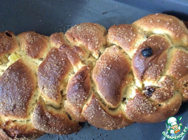 Готовую плетенку перенести на противень и, накрыв полотенцем. оставить на расстойку на 30 минут. Затем смазать желтком с ложкой молока и посыпать сахаром. Выпекать 30 минут при Т 180С.