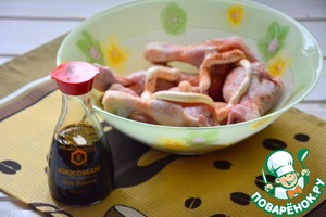 Для начала нужно замариновать куриные голени в соевом соусе и майонезе (добавить паприку). Дать помариноваться часок