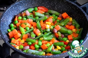 Тем временем обжарить готовую овощную смесь на растительном масле (смесь можно взять по своему вкусу). Посолить по вкусу и дать остыть.