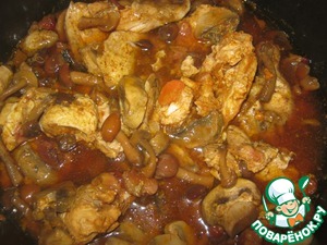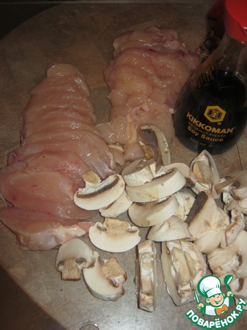 Шампиньоны нарезать, грудку тоже нарезать на крупные кусочки