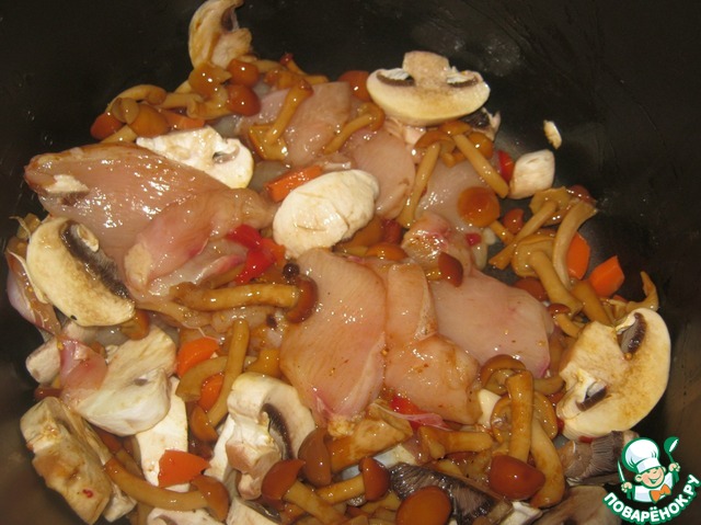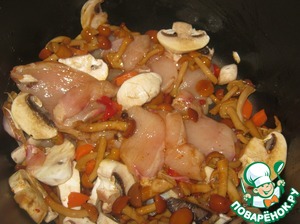 Перемешать в чаше мультиварке замаринованную грудинку и грибы