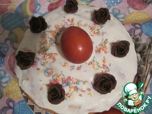 Поверхность кулича глазируем, украшаем розами из шоколада (растопленный шоколад смешиваем с медом, получается пластичная масса)