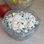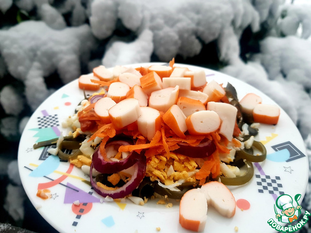Седьмой - крабовые палочки. Их можно мелко порезать, можно - на терку. У меня они очень уж мило разворачивались, поэтому сделала так.