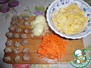 Нарезаем овощи. Из фарша делаем маленькие фрикадельки.