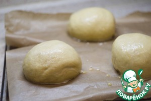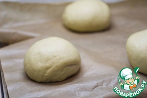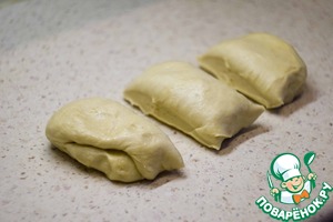 Подошедшее тесто обомните и разделите на 3 равные части, пусть полежат 10 минут (для отдыха клейковины, чтобы не рвалась при формовке).