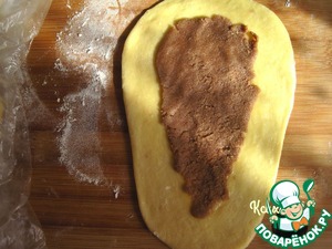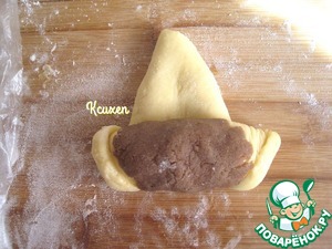 Каждый кусочек дрожжевого теста раскатываем в пласт, у которого верхняя сторона шире, чем нижняя (похоже на язычок).