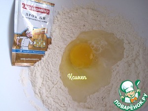 Для приготовления этого теста нужно почти сутки! Для дрожжевой опары: смешаем муку и сухие дрожжи "Саф-Момент, сделаем лунку, разобъём в неё яйцо, немного разболтав его, добавим тёплую воду. Замесим мягкое и липкое тесто для опары. Долго вымешивать не нужно.