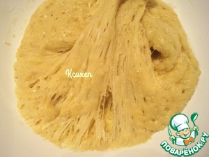 Замесим мягкое, липкое тесто. Вымешивать его нужно долго (около 10-ти минут). Во время замеса я добавила ещё пару горстей муки, потому что мне показалось, что тесто плохо держит форму. В итоге получилось эластичное тесто, которое немного липнет, но не пачкает руки. Готовое тесто переложим в смазанную растительным маслом посуду. Накроем и оставим при комнатной t на 40 минут. Далее уберём посуду с тестом в холодильник на 8-16 часов.